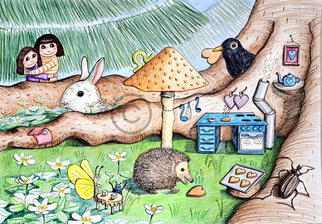 Jeg printer alle plakater i A4, A3 og nogle findes også i A2. Det kommer an på originaltegningens størrelse. Ønsker du f.eks to brødre (På tegningen af skovkøkkenet herunder) med lyst hår der krammer, kan jeg lave en “speciel edition” til en god pris, bare spørg 🙂