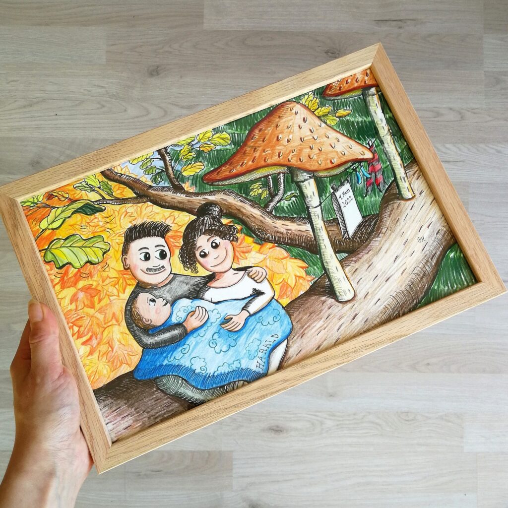 “Vi er SÅ glade for denne personlige dåbsgave vi fik til vores søns barnedåb. Den pynter flot i hjemmet og er et unikt minde om den første tid som forældre. Gitte har virkelig indfanget stemningen der er i det lille nye familierum og den store kærlighed der opstår til et nyfødt barn. Helt perfekt gave.”